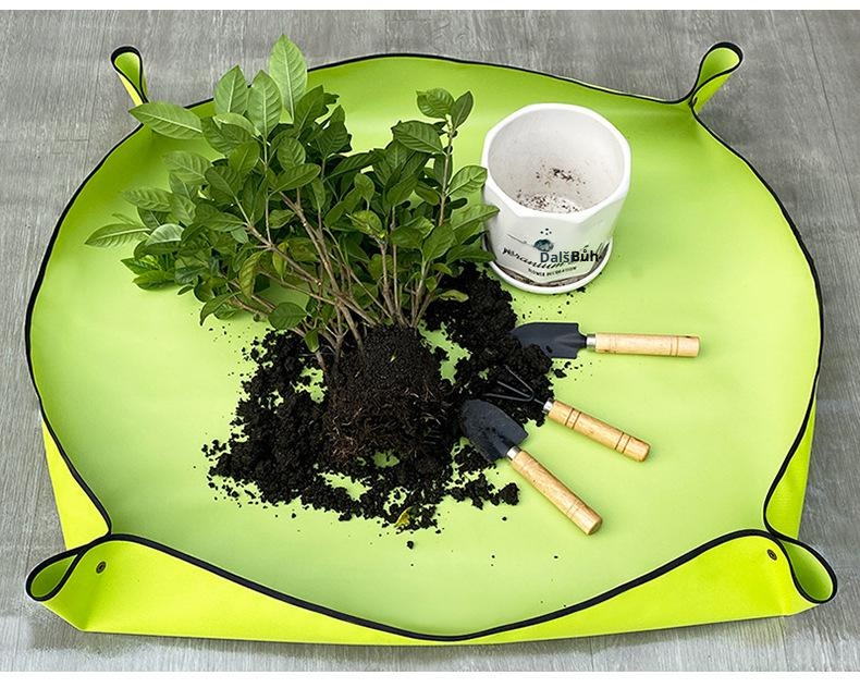PVC polyester waterproof gardening mat for clean plant repotting; protects surfaces, easy to clean, foldable, reusable; ideal for succulents, green radish, household use.